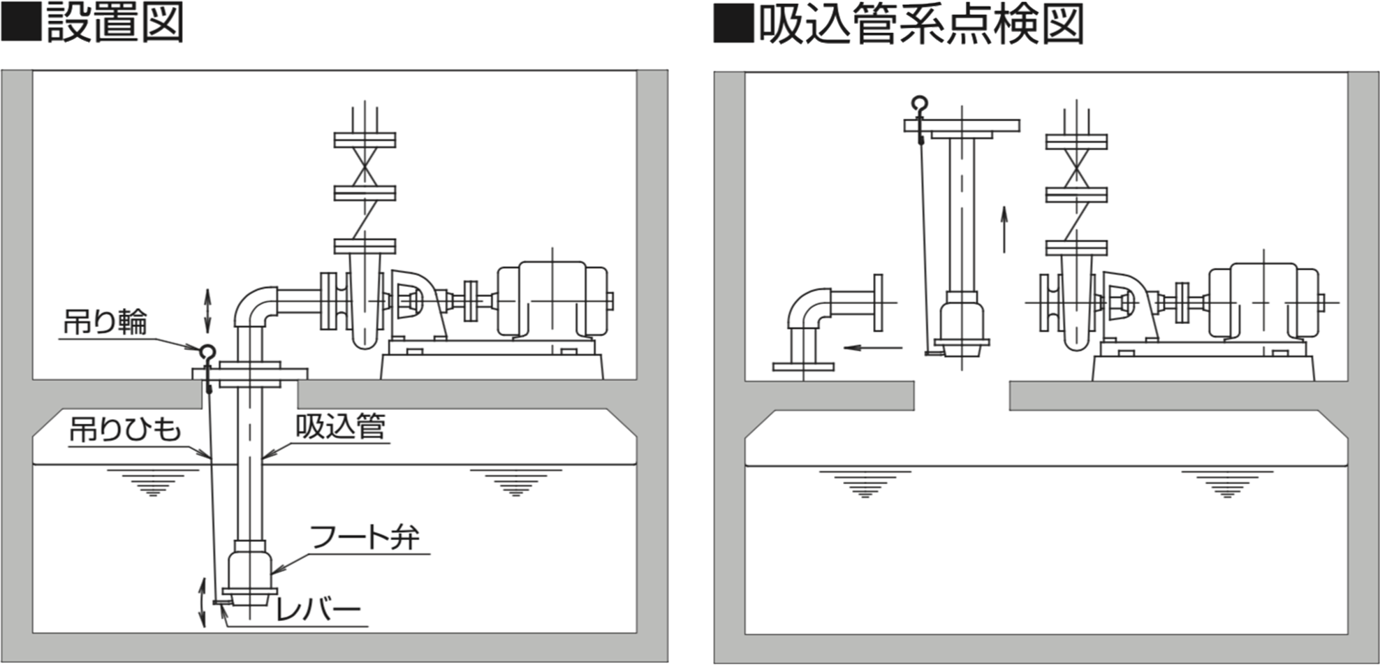 - ・受水槽内に入らずに地上に吸込配管ごと引き上げて、フート弁及び吸込配管の保守・点検ができます。